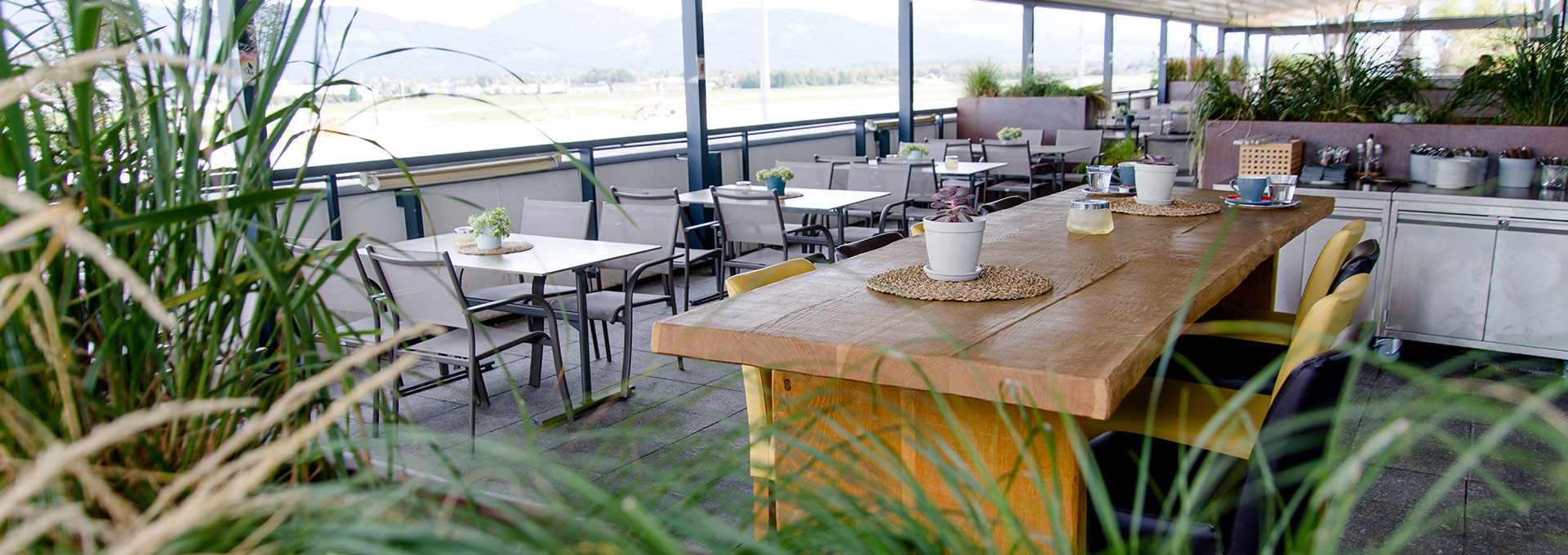 „Das Wolfgang“ mit Dachterrasse am Salzburg Airport verwöhnt mit kulinarischen Genüssen und Blick auf das Flughafenvorfeld.
