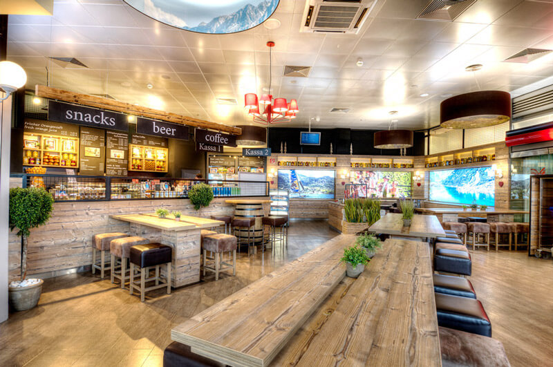 ...Erfrischungsgetränken, einer feinen Auswahl an kalten und warmen Imbissen, Kaffee und Mehlspeisen. Hier finden Sie auch österreichische Souvenirs, erlesene Confiserie, Schnäpse, kulinarische Spezialitäten u.v.m.