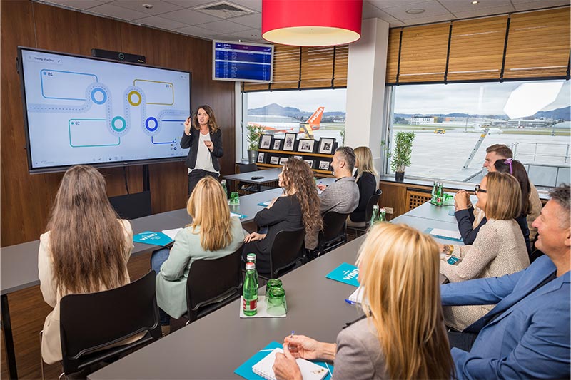 The fully air-conditioned conference room Gaisberg is located on the first floor of the airport terminal. It combines state-of-the-art technology with a pleasant working environment for inspiring meetings and seminars.