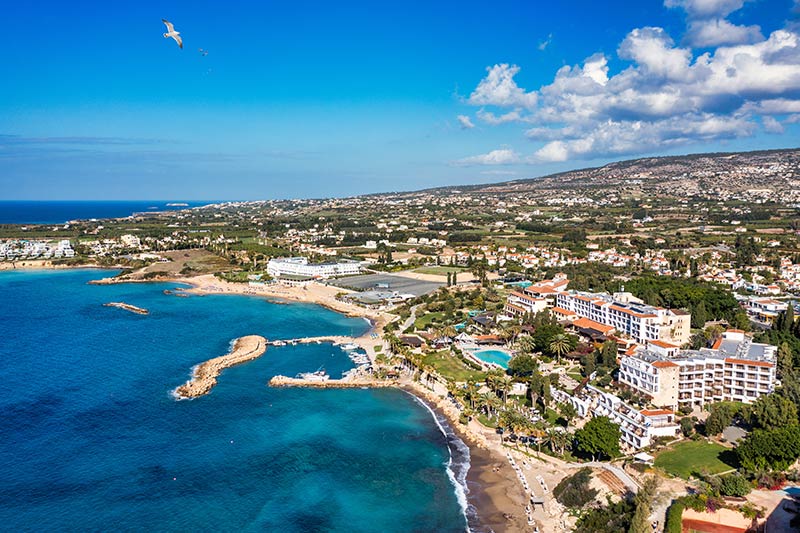 Paphos ist mit seinem kleinen Fischerhafen das bedeutende Ferienzentrum an der westlichen Küste Zyperns. Der Ort ist in zwei Bereiche untergliedert: „Nea Paphos“ und „Ktima“. Neben den vielen Einkaufs- und Unterhaltungsmöglichkeiten bietet Paphos ein unvergleichbares Angebot antiker Ausgrabungen und kultureller Sehenswürdigkeiten. Die „römischen Villen“ mit den beeindruckenden Mosaiken, das „Odeon Amphitheater“ und die Königsgräber haben dazu beigetragen, dass Paphos in das UNESCO-Weltkulturerbe aufgenommen wurde. Spazieren Sie am Abend durch den romantischen Hafen vor der Kulisse des Kastells und genießen Sie den Sonnenuntergang in einer der vielen Tavernen. Viele Hotels verfügen über kleine Badebuchten mit Kiesstrand oder einen Steg bzw. ein Badeplateau mit Zugang zum Meer. Da das Meer teilweise mit Felsen durchsetzt ist, empfiehlt sich die Mitnahme von Badeschuhen. In der Region Paphos verfügen 6 Strände aufgrund der hervorragenden Wasserqualität über die „Blaue Flagge“.