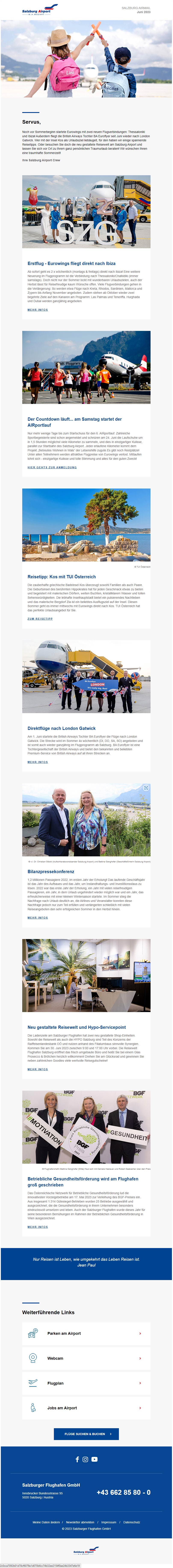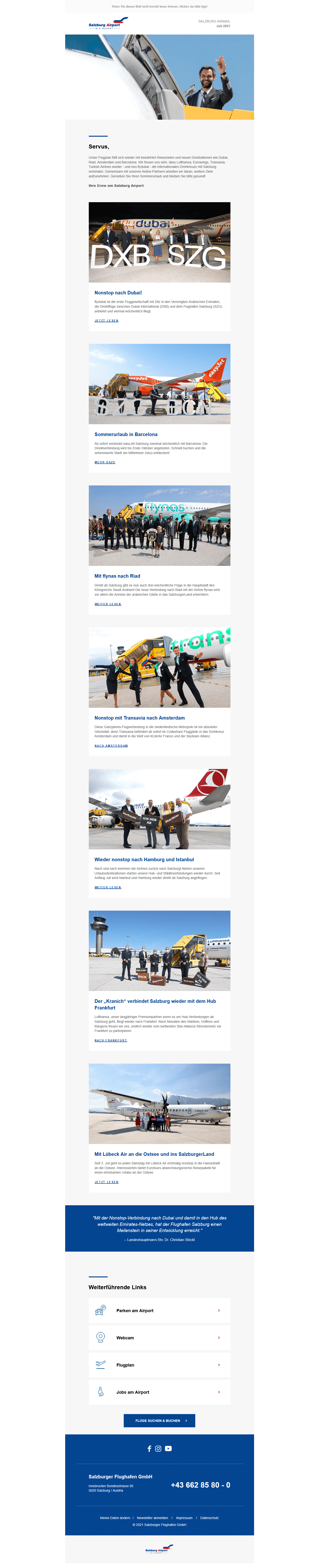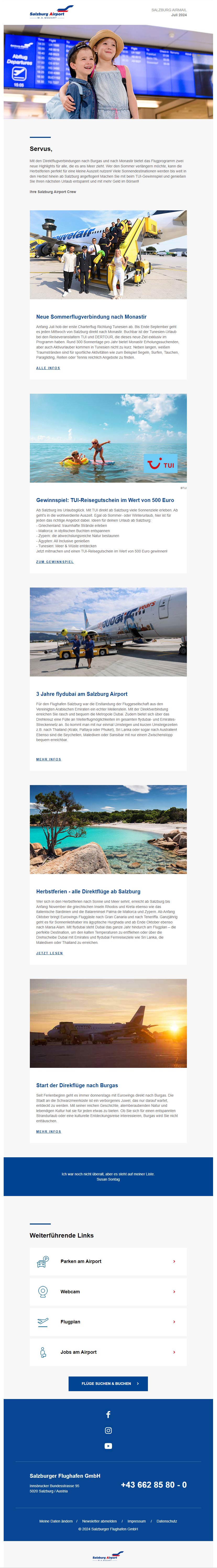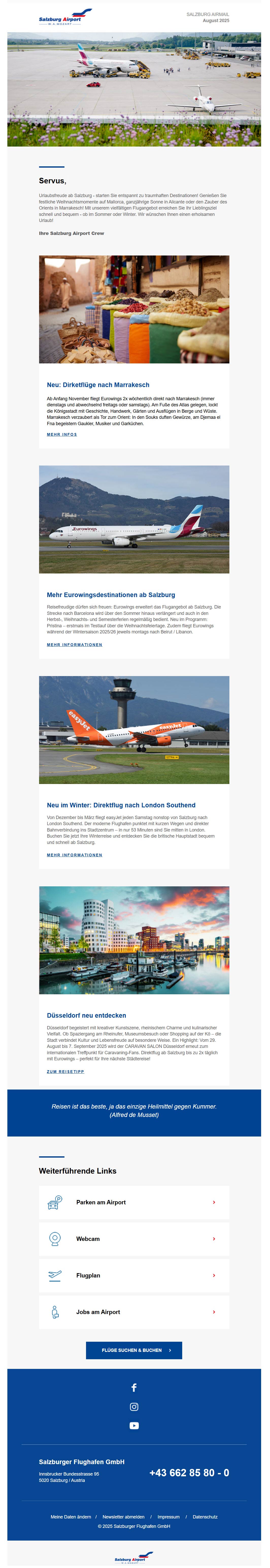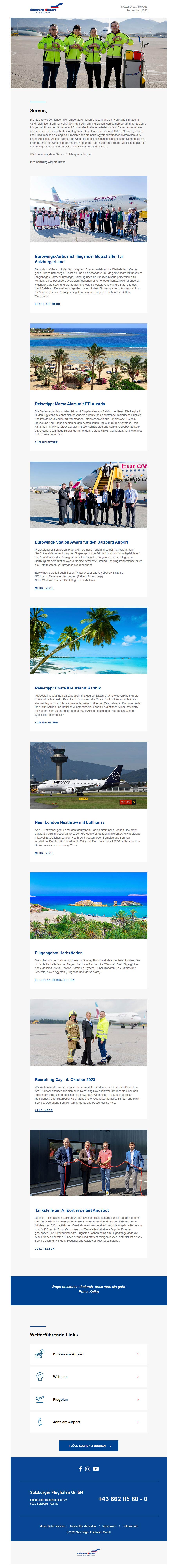 Sie wollen die aktuellen Infos vom Salzburger Flughafen erhalten? Dann melden Sie sich für unseren Newsletter an! Erfahren Sie alles über Urlaubs- & Städteflügen, Infos zu neuen Destinationen, zu Jobangeboten, Gastronomiebetriebe und Shops am Flughafen, Reiseveranstalter, Airlines u.v.m.