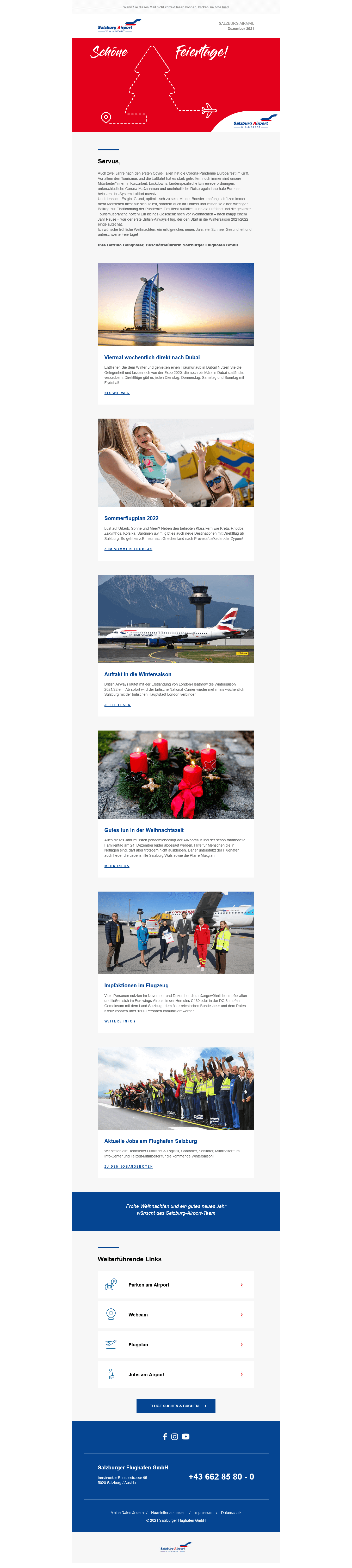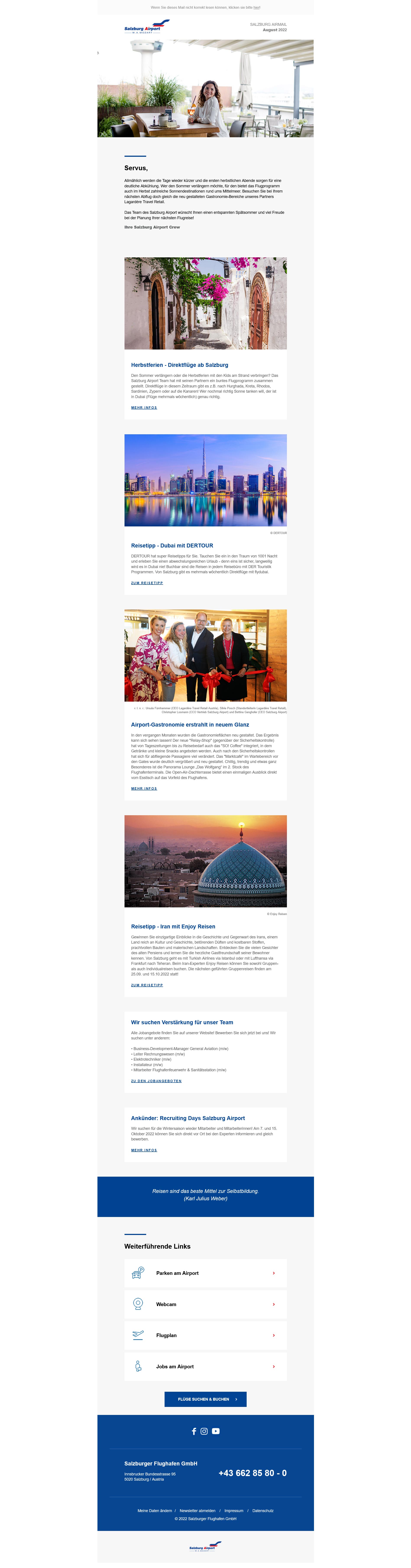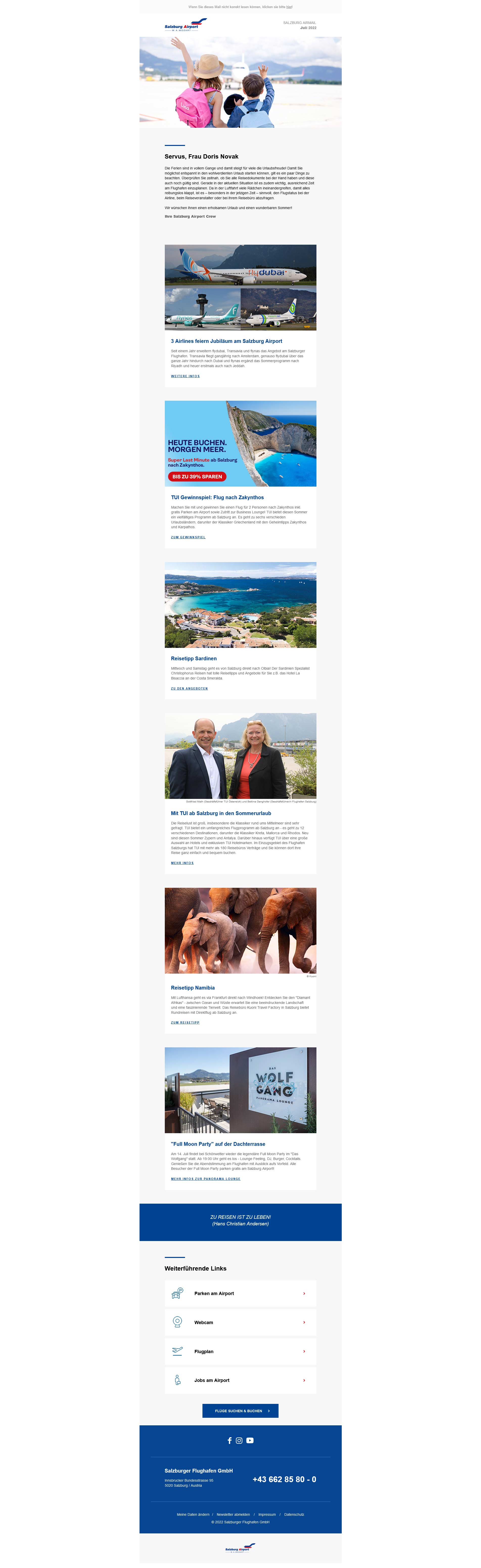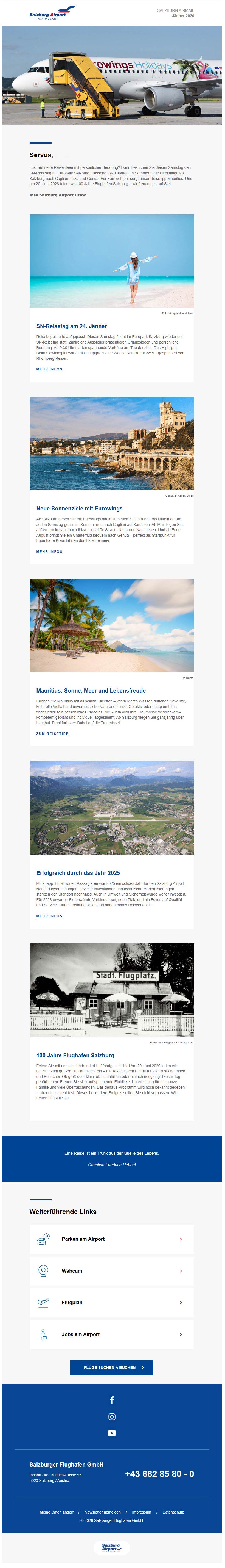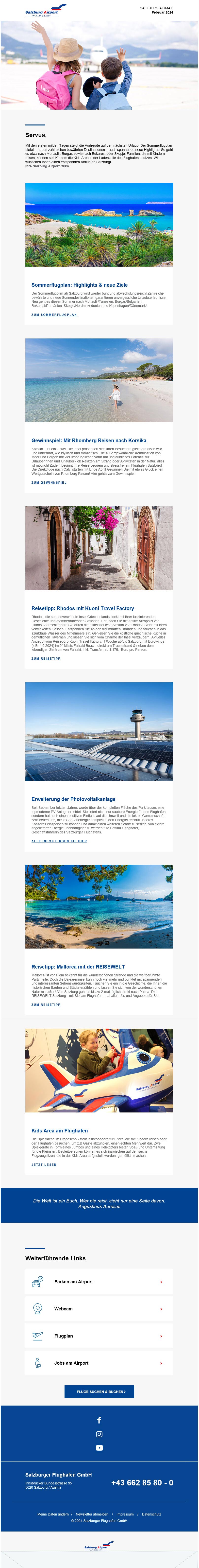 Sie wollen die aktuellen Infos vom Salzburger Flughafen erhalten? Dann melden Sie sich für unseren Newsletter an! Erfahren Sie alles über Urlaubs- & Städteflügen, Infos zu neuen Destinationen, zu Jobangeboten, Gastronomiebetriebe und Shops am Flughafen, Reiseveranstalter, Airlines u.v.m.