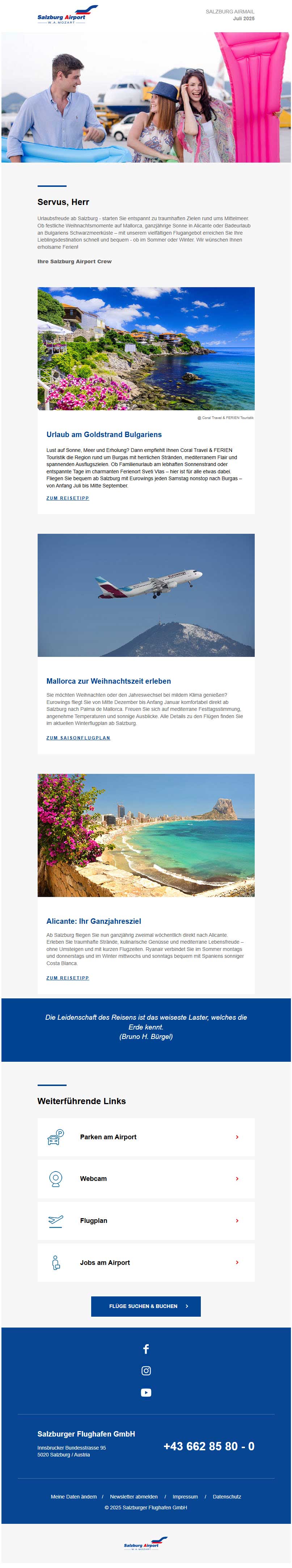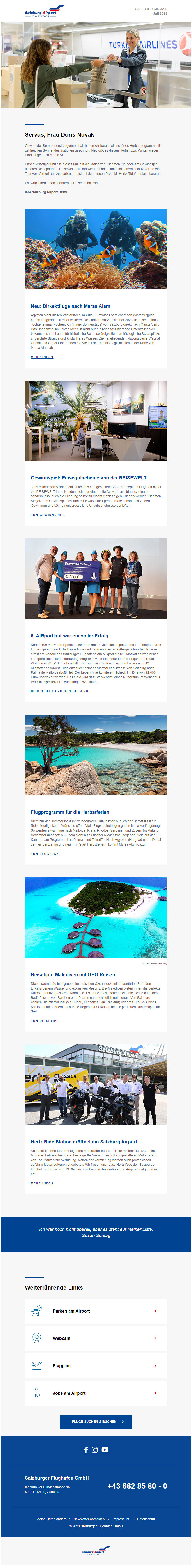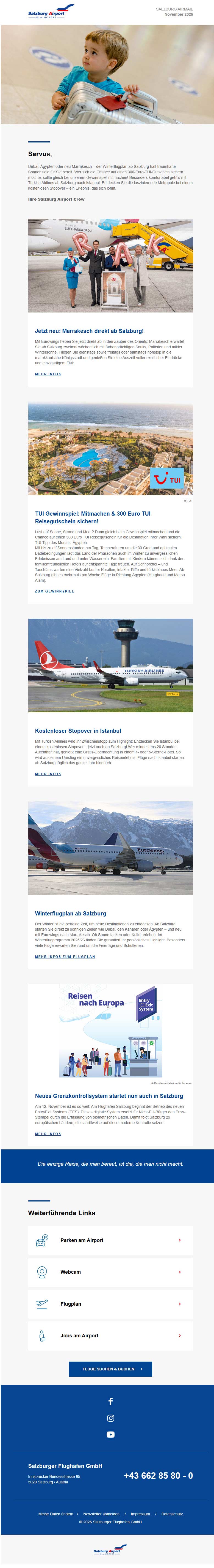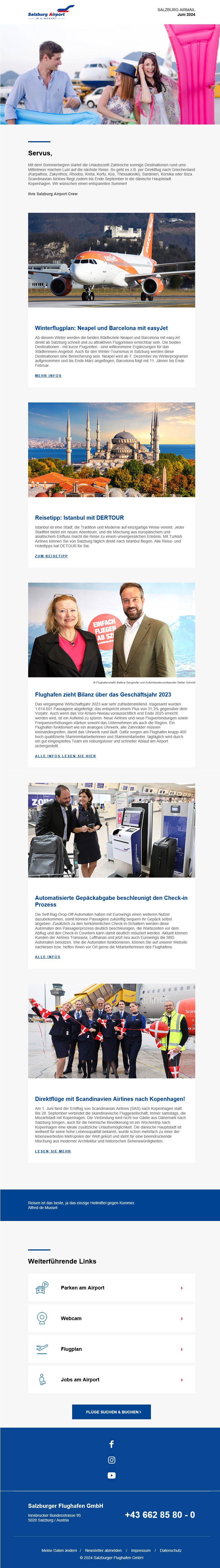 Sie wollen die aktuellen Infos vom Salzburger Flughafen erhalten? Dann melden Sie sich für unseren Newsletter an! Erfahren Sie alles über Urlaubs- & Städteflügen, Infos zu neuen Destinationen, zu Jobangeboten, Gastronomiebetriebe und Shops am Flughafen, Reiseveranstalter, Airlines u.v.m.