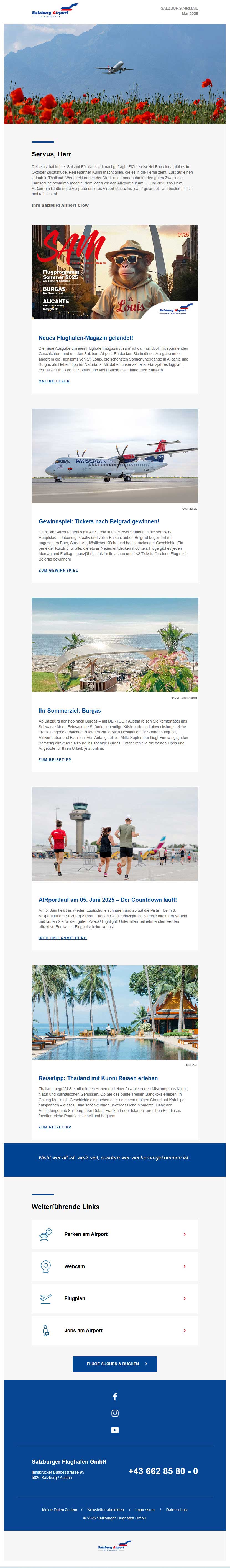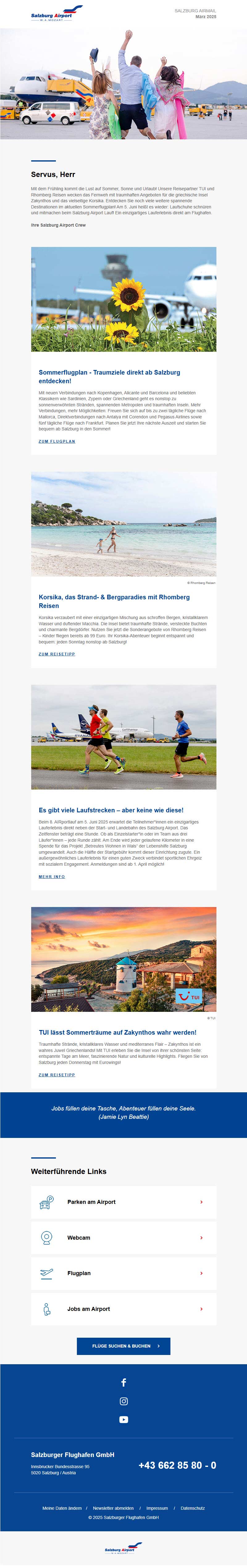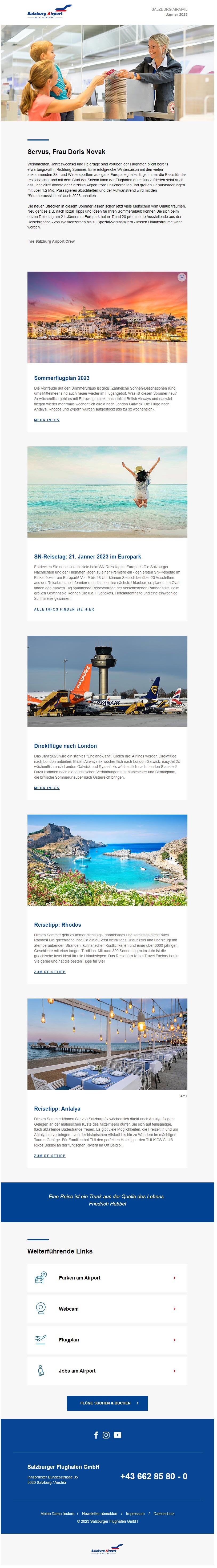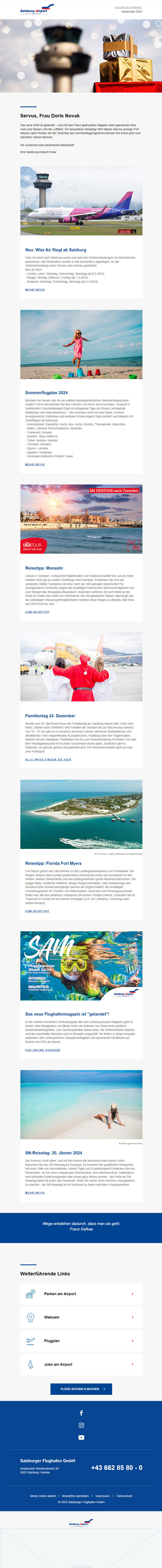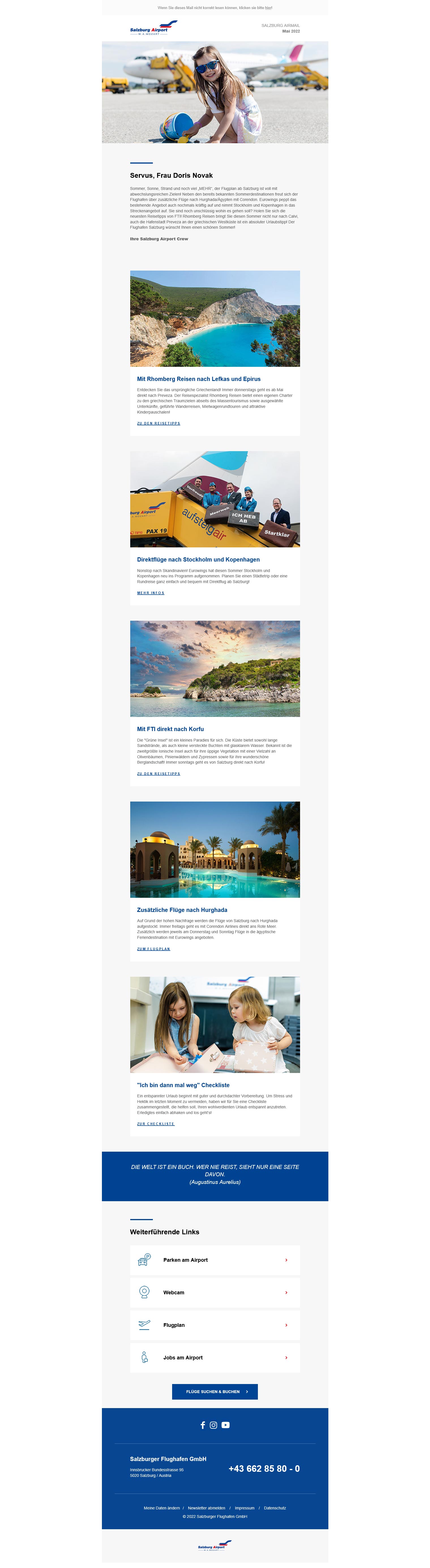 Sie wollen die aktuellen Infos vom Salzburger Flughafen erhalten? Dann melden Sie sich für unseren Newsletter an! Erfahren Sie alles über Urlaubs- & Städteflügen, Infos zu neuen Destinationen, zu Jobangeboten, Gastronomiebetriebe und Shops am Flughafen, Reiseveranstalter, Airlines u.v.m.