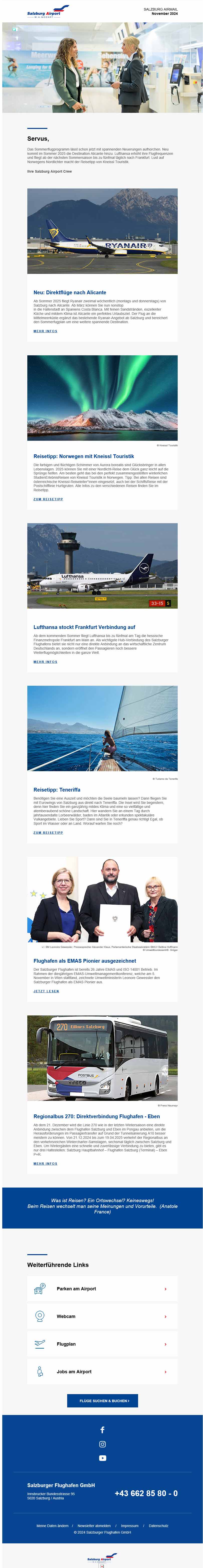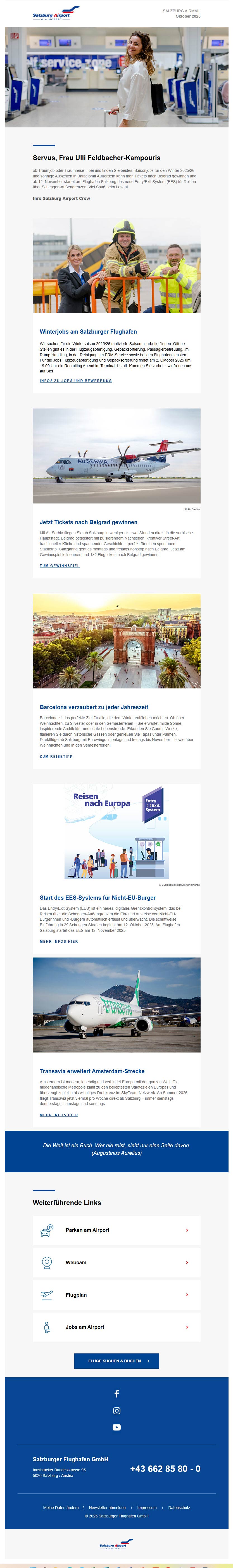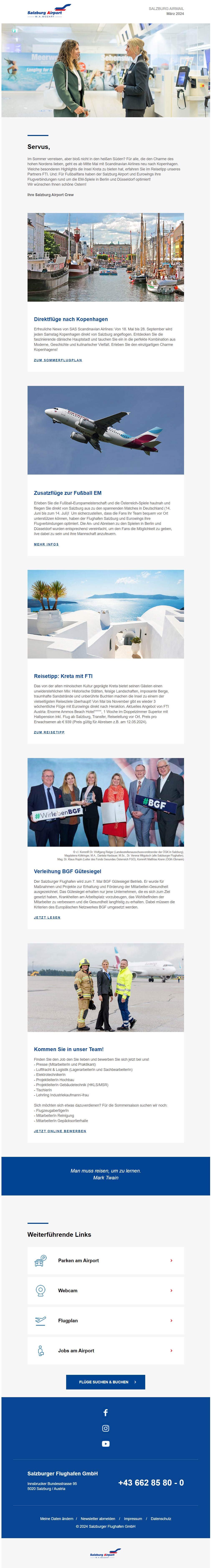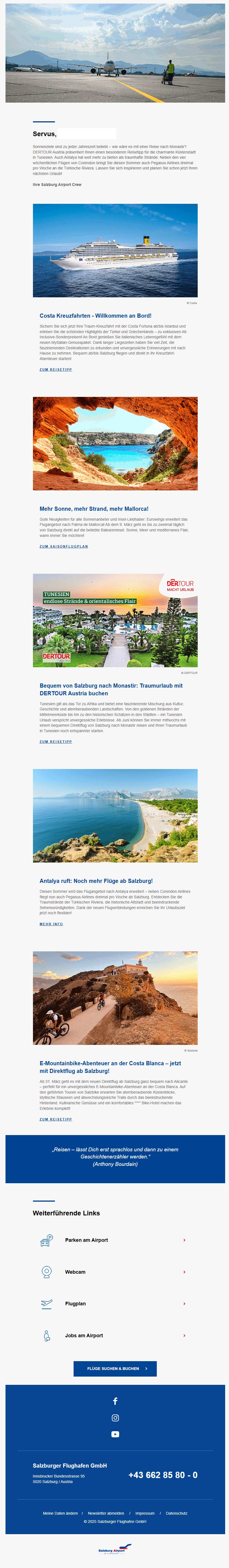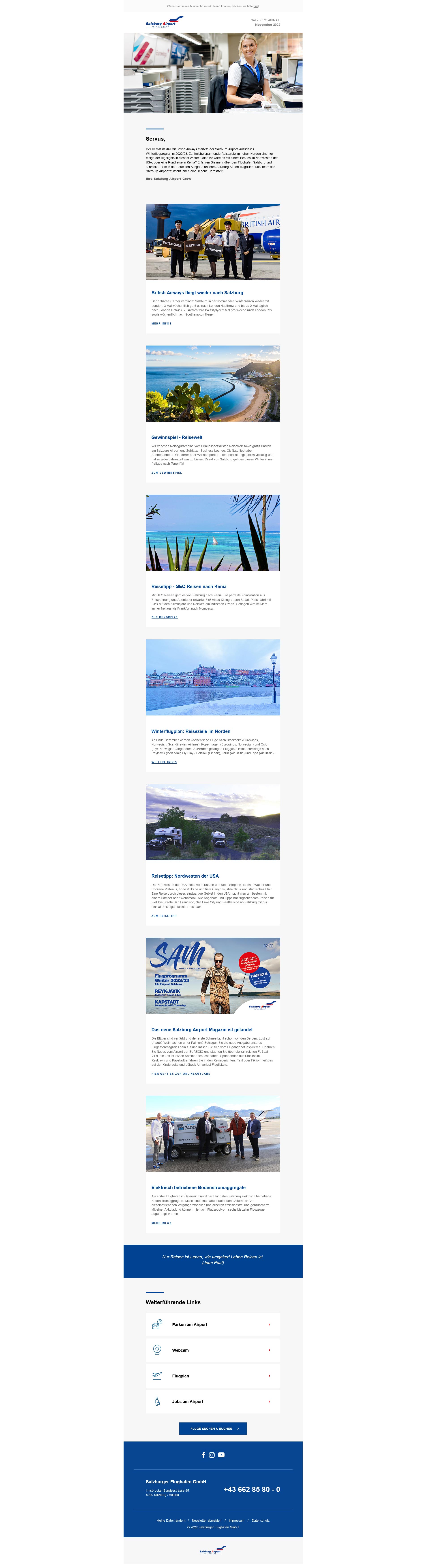 Sie wollen die aktuellen Infos vom Salzburger Flughafen erhalten? Dann melden Sie sich für unseren Newsletter an! Erfahren Sie alles über Urlaubs- & Städteflügen, Infos zu neuen Destinationen, zu Jobangeboten, Gastronomiebetriebe und Shops am Flughafen, Reiseveranstalter, Airlines u.v.m.