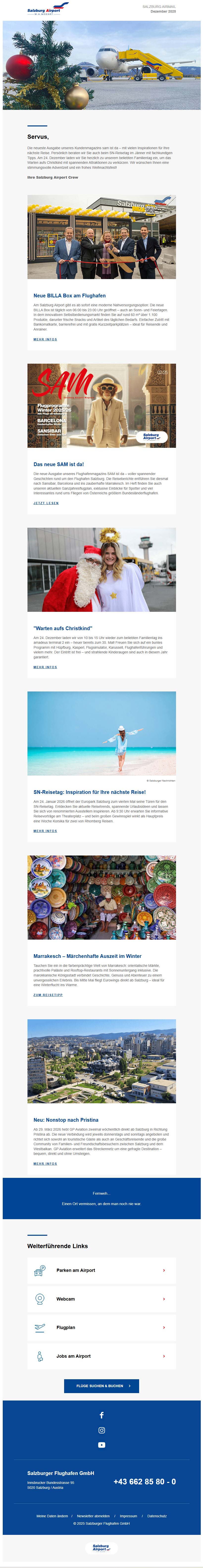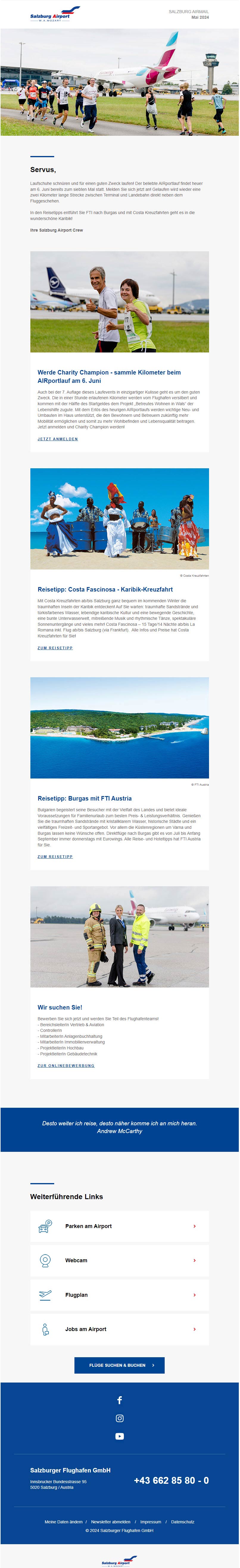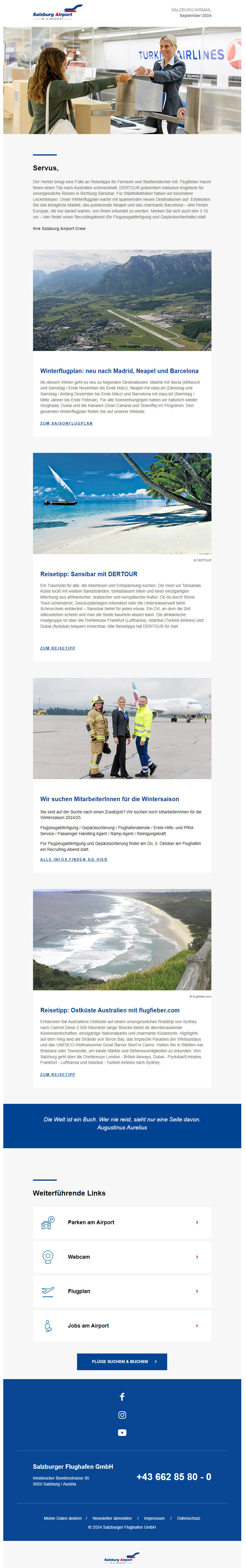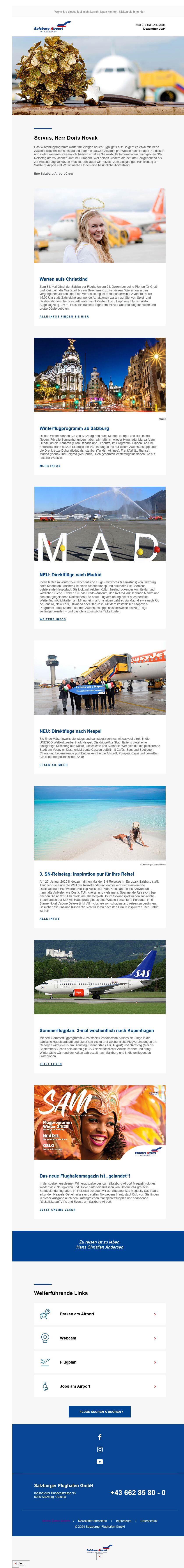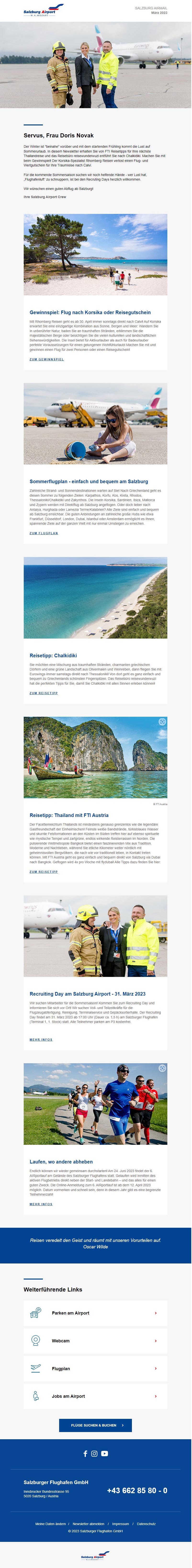 Sie wollen die aktuellen Infos vom Salzburger Flughafen erhalten? Dann melden Sie sich für unseren Newsletter an! Erfahren Sie alles über Urlaubs- & Städteflügen, Infos zu neuen Destinationen, zu Jobangeboten, Gastronomiebetriebe und Shops am Flughafen, Reiseveranstalter, Airlines u.v.m.