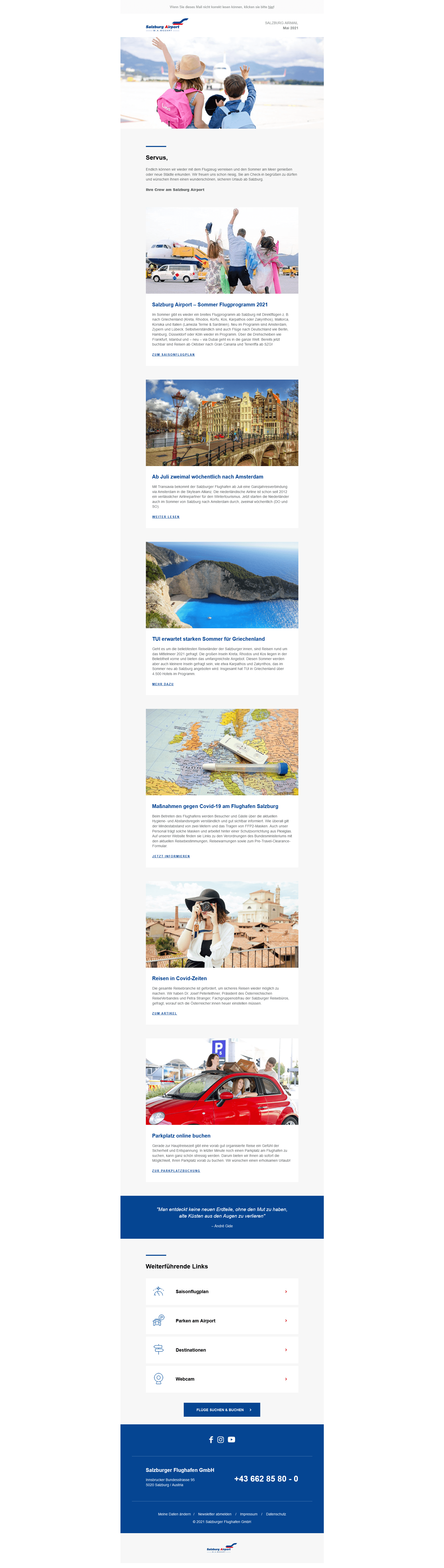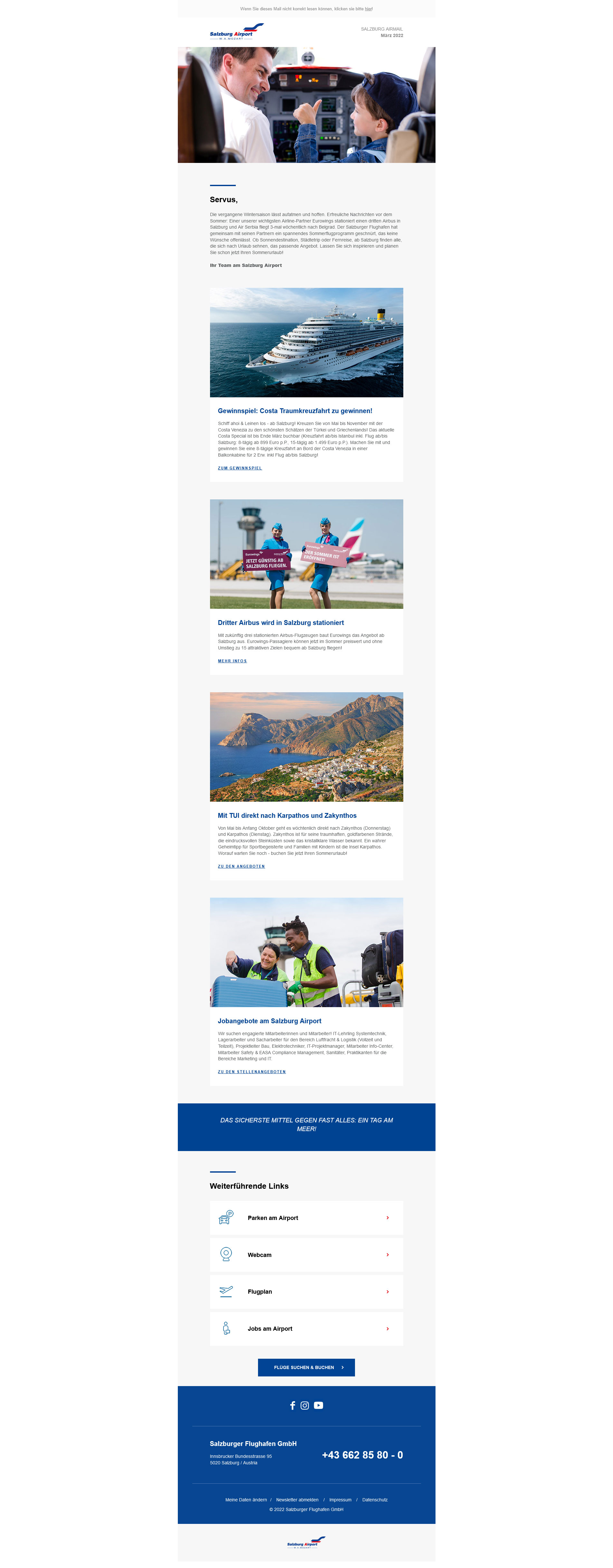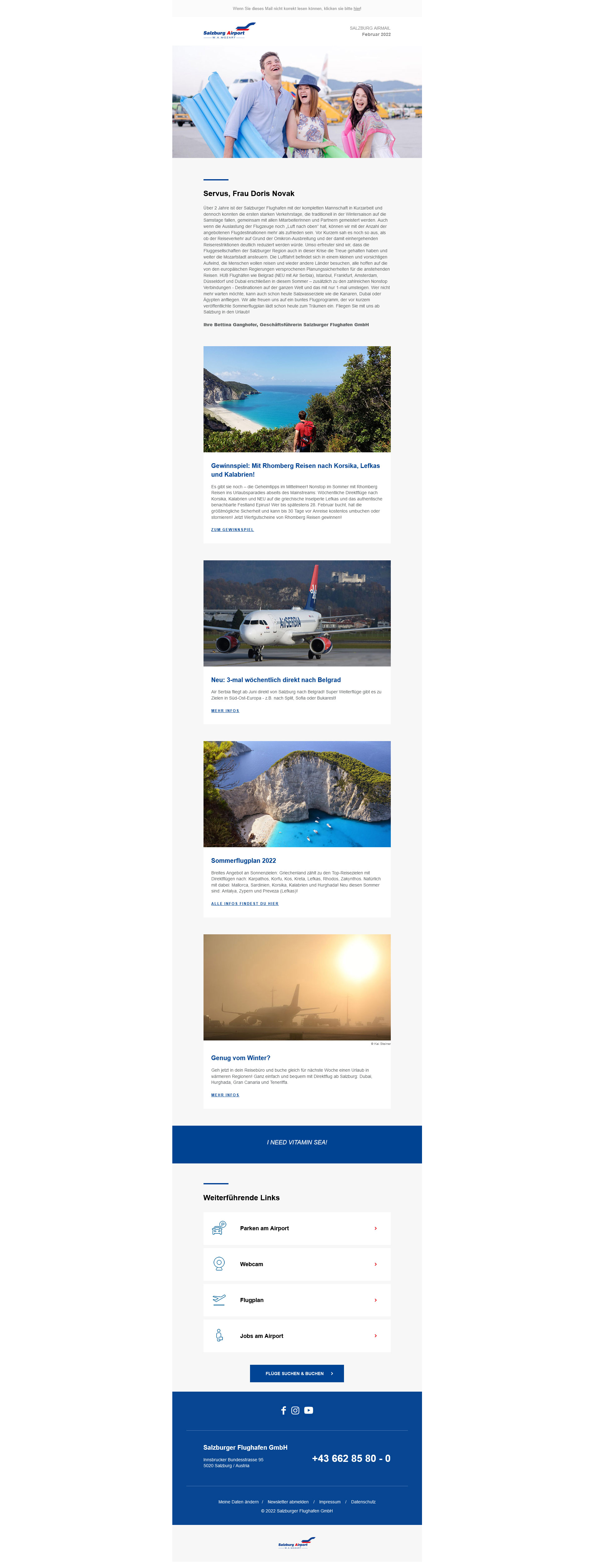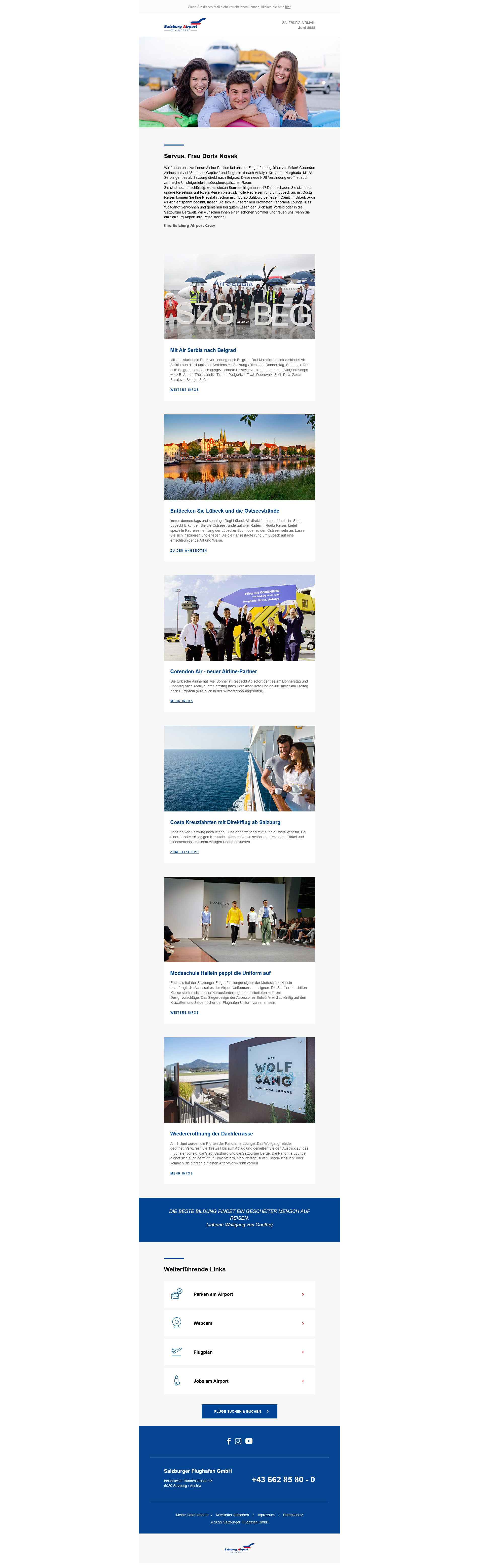 Nach Ihrer Registrierung erhalten Sie eine automatische Nachricht zur Bestätigung Ihrer Anmeldung und Ihres E-Mail-Kontos. Die Angabe des Namens ist freiwillig. Er wird nur zur Personalisierung des Newsletters verwendet. Ihre Daten werden nicht an Dritte weitergegeben. In jedem Newsletter haben Sie die Möglichkeit, Ihre Daten zu ändern oder Ihr Abonnement zu kündigen. Bitte fügen Sie die Adresse airmail@salzburg-airport.at zu Ihren Kontakten hinzu, damit unser Newsletter in Ihrem Postfach landet. Herzlichen Dank für Ihr Vertrauen und bis bald!