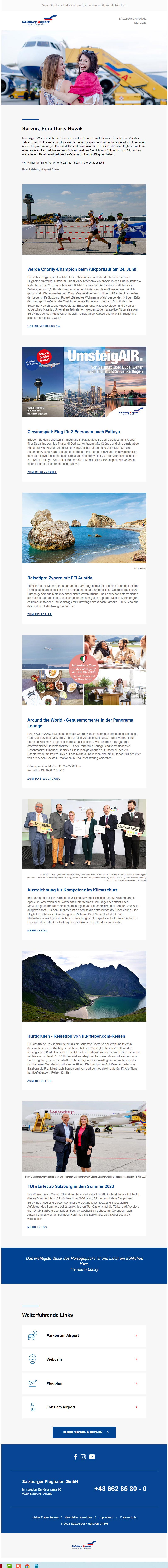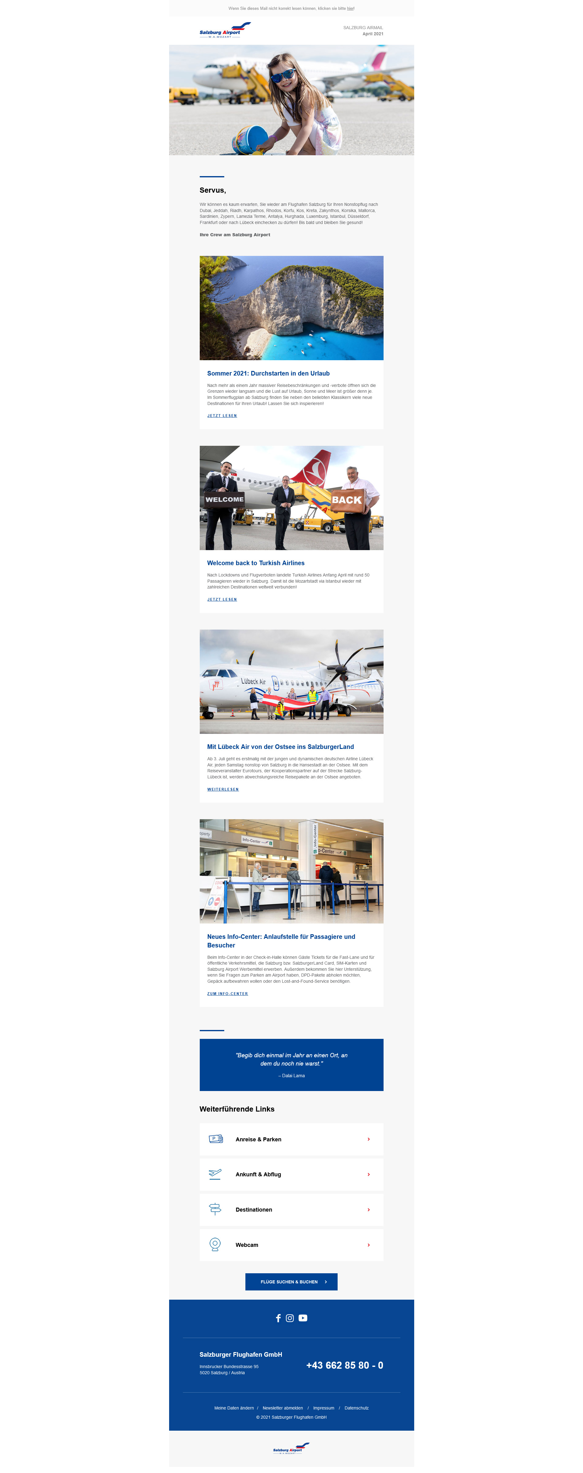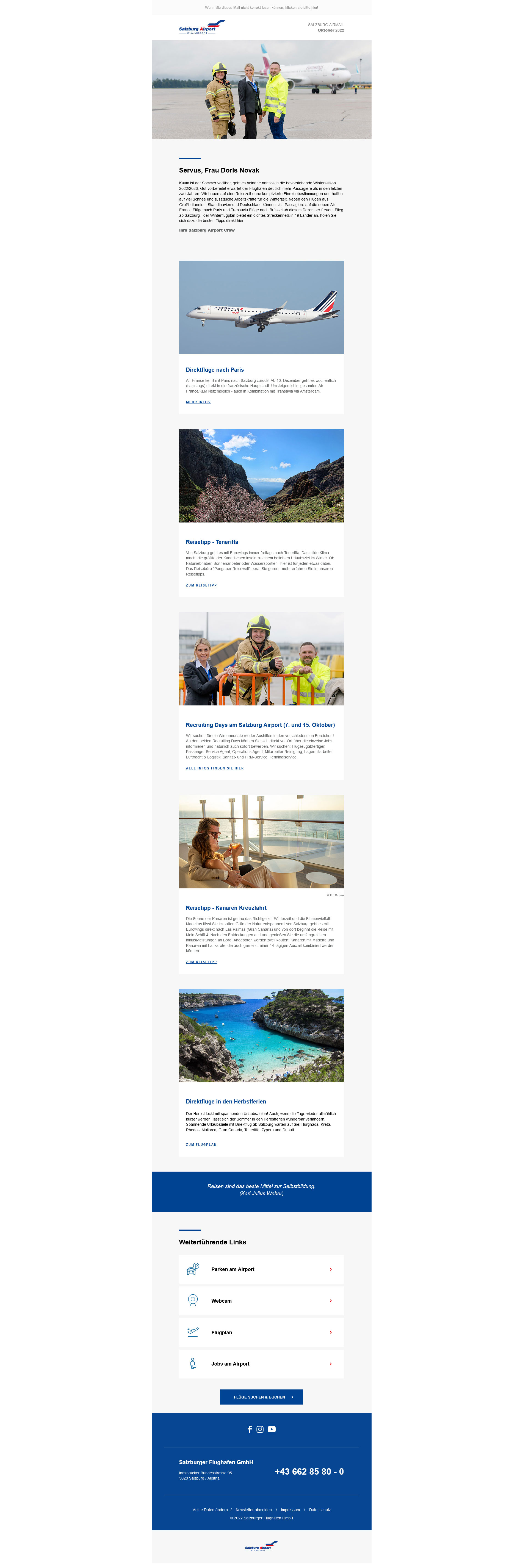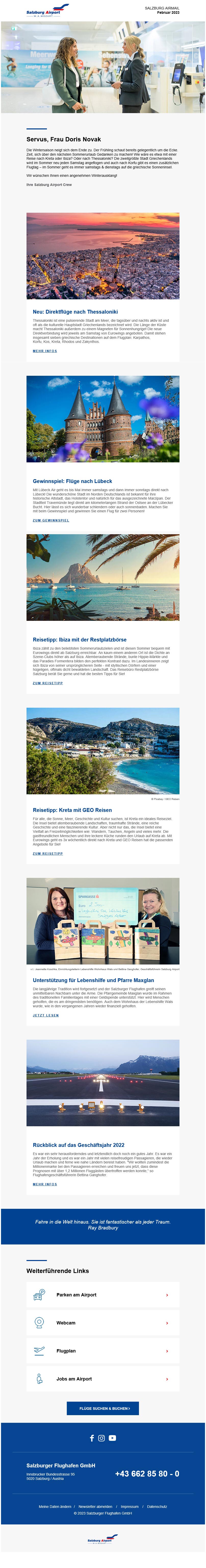 Nach Ihrer Registrierung erhalten Sie eine automatische Nachricht zur Bestätigung Ihrer Anmeldung und Ihres E-Mail-Kontos. Die Angabe des Namens ist freiwillig. Er wird nur zur Personalisierung des Newsletters verwendet. Ihre Daten werden nicht an Dritte weitergegeben. In jedem Newsletter haben Sie die Möglichkeit, Ihre Daten zu ändern oder Ihr Abonnement zu kündigen. Bitte fügen Sie die Adresse airmail@salzburg-airport.at zu Ihren Kontakten hinzu, damit unser Newsletter in Ihrem Postfach landet. Herzlichen Dank für Ihr Vertrauen und bis bald!