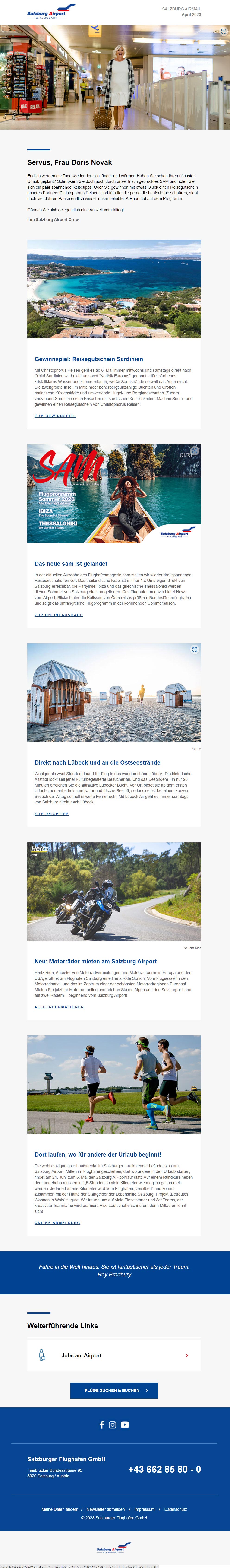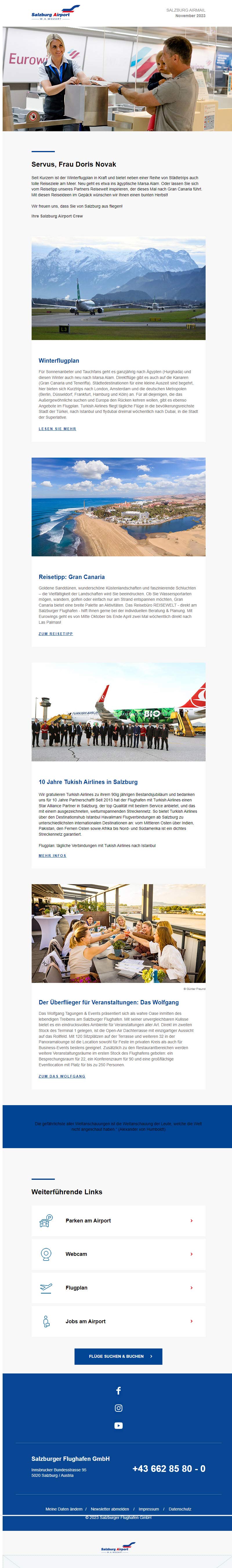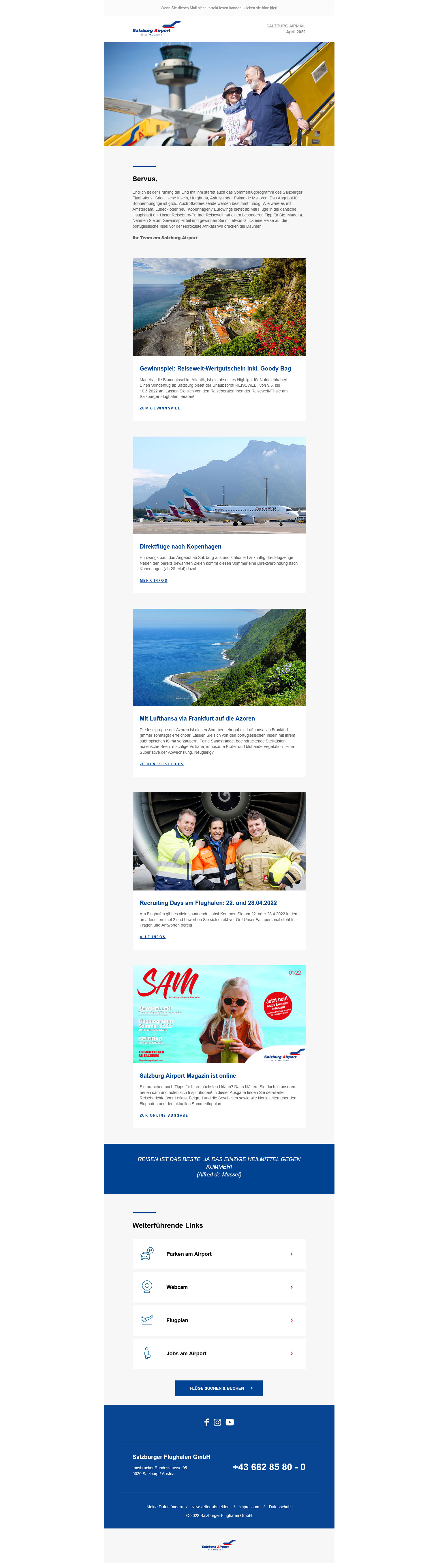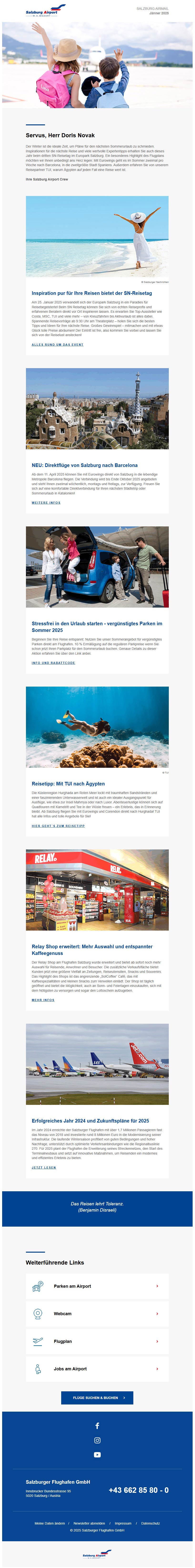 Nach Ihrer Registrierung erhalten Sie eine automatische Nachricht zur Bestätigung Ihrer Anmeldung und Ihres E-Mail-Kontos. Die Angabe des Namens ist freiwillig. Er wird nur zur Personalisierung des Newsletters verwendet. Ihre Daten werden nicht an Dritte weitergegeben. In jedem Newsletter haben Sie die Möglichkeit, Ihre Daten zu ändern oder Ihr Abonnement zu kündigen. Bitte fügen Sie die Adresse airmail@salzburg-airport.at zu Ihren Kontakten hinzu, damit unser Newsletter in Ihrem Postfach landet. Herzlichen Dank für Ihr Vertrauen und bis bald!