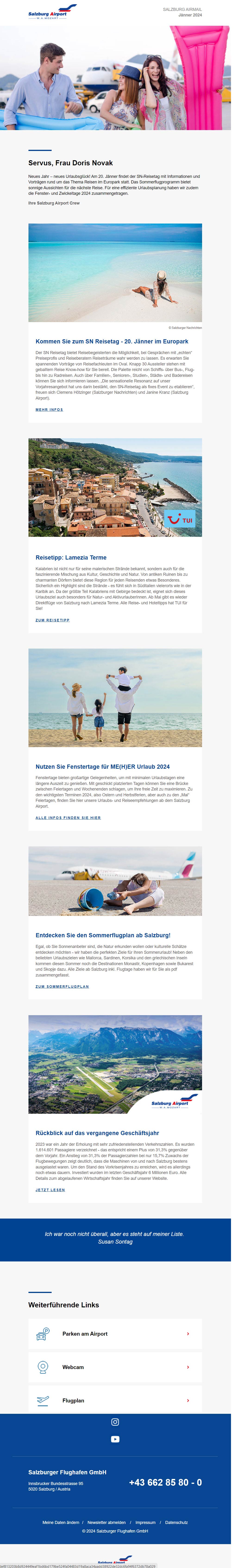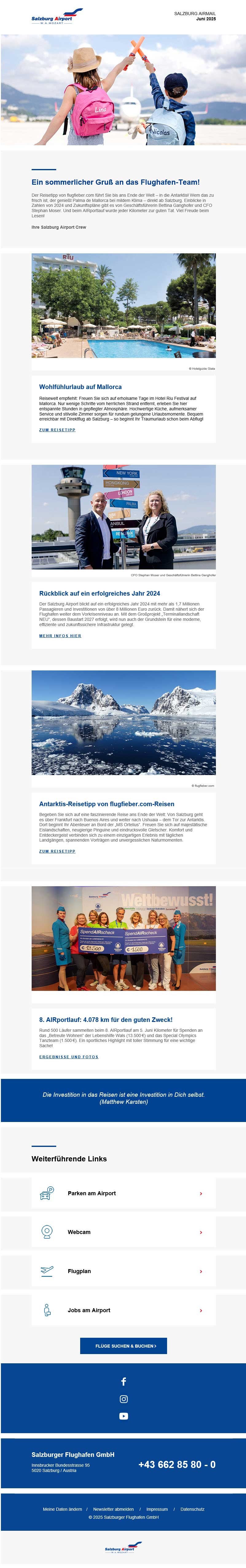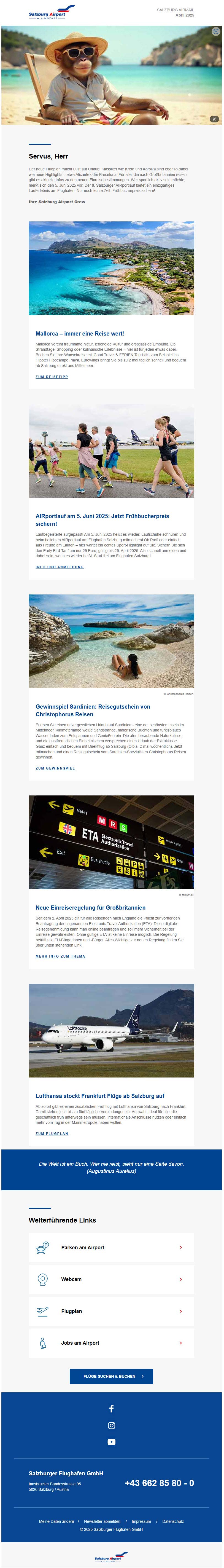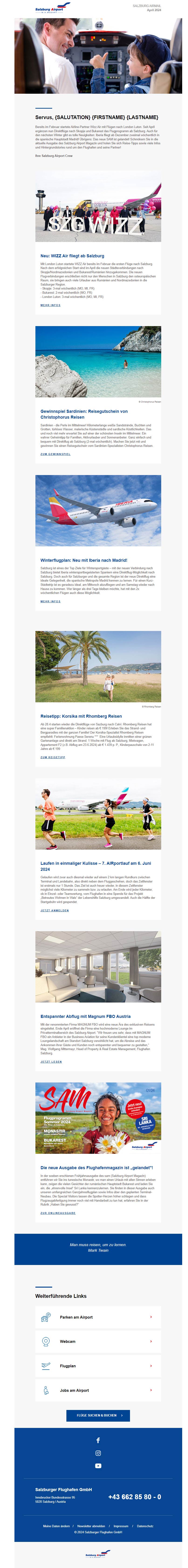 Nach Ihrer Registrierung erhalten Sie eine automatische Nachricht zur Bestätigung Ihrer Anmeldung und Ihres E-Mail-Kontos. Die Angabe des Namens ist freiwillig. Er wird nur zur Personalisierung des Newsletters verwendet. Ihre Daten werden nicht an Dritte weitergegeben. In jedem Newsletter haben Sie die Möglichkeit, Ihre Daten zu ändern oder Ihr Abonnement zu kündigen. Bitte fügen Sie die Adresse airmail@salzburg-airport.at zu Ihren Kontakten hinzu, damit unser Newsletter in Ihrem Postfach landet. Herzlichen Dank für Ihr Vertrauen und bis bald!