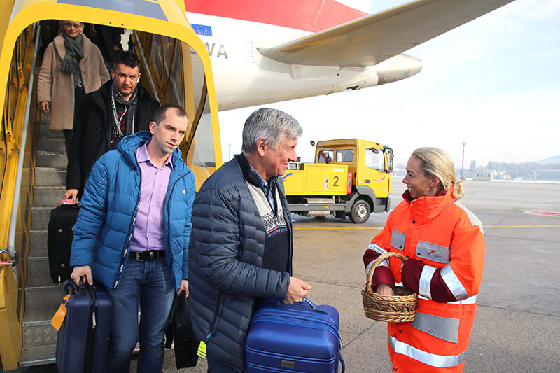 Bei -7°Celsius war es zwar wetterbedingt ein kalter Empfang der Fluggäste aus Frankfurt, dafür jedoch ein umso herzlicherer. Gemeinsam mit dem Bereichsleiter Aviation & Sales, Flughafen-Prokurist Christopher Losmann, begrüßte Flughafengeschäftsführerin Bettina Ganghofer die knapp unter 100 Passagiere der heutigen 10:10 Uhr Maschine aus Frankfurt. Mit ca. 10 Minuten Verspätung landete der moderne Embraer Jet in der rot-weißen Lackierung der Austrian am Salzburg Airport W. A. Mozart. Begrüßt wurden die aussteigenden Fluggäste - wie bei solchen Jubiläen üblich - mit Mozartkugeln.
