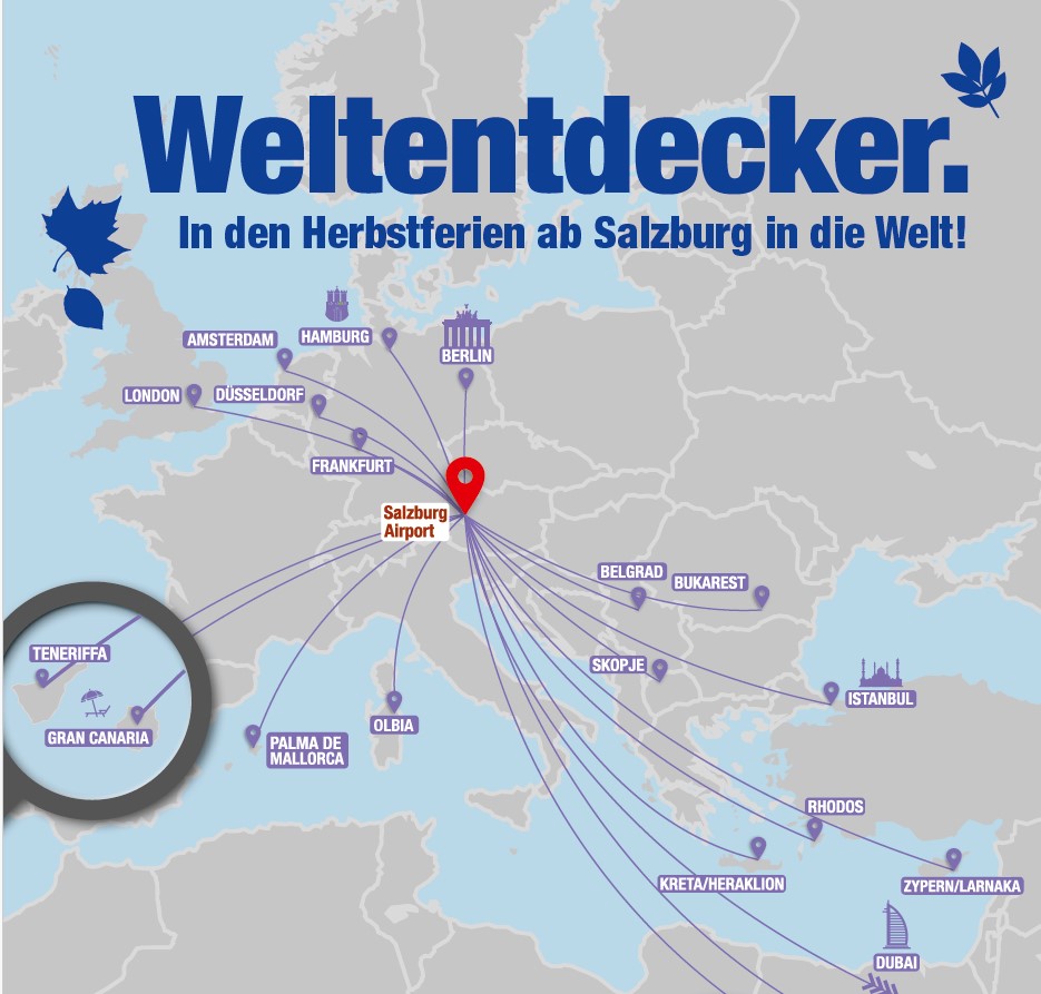 Wer sich in den Herbstferien nach Sonne und Meer sehnt, erreicht ab Salzburg bis Anfang November die griechischen Inseln Rhodos und Kreta ebenso wie das italienische Sardinien. Auch Zypern steht bis in den Herbst hinein auf dem Flugprogramm. Ab Anfang Oktober bringt Eurowings Fluggäste nach Gran Canaria und nach Teneriffa. Palma de Mallorca wird bis Anfang November angeboten und als Tipp vorweg: ebenso zu den Weihnachts- und Silvesterfeiertagen. Ganzjährig geht es für Sonnenliebhaber ins ägyptische Hurghada und ab Ende Oktober ebenso nach Marsa Alam. Mit flydubai steht Dubai das ganze Jahr hindurch am Flugplan – die perfekte Destination, um den kalten Temperaturen zu entfliehen oder über die Drehscheibe Dubai mit Emirates und flydubai Fernreiseziele wie Sri Lanka, die Malediven oder Thailand zu erreichen.
