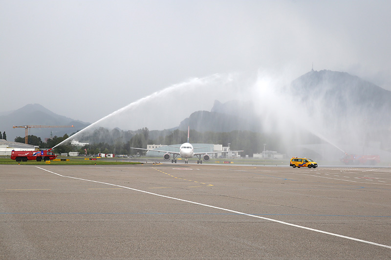 Die Erstlandung wurde vom Wasserbogen zweier Flughafenlöschfahrzeuge begleitet. Die geladenen Gäste wurden auf der Dachterrasse im „Das Wolfgang“ willkommen geheißen, das erst kürzlich geöffnet wurde. Neben Vertretern von Air Serbia, begrüßte Flughafengeschäftsführerin Bettina Ganghofer gemeinsam mit der serbischen Generalkonsulin Svetlana Stankovic die ersten Gäste aus Niš. Nach der Landung hatten die geladenen Gäste die Gelegenheit, sich zum Potenzial der neuen Destination mit Experten aus Wirtschaft und Tourismus auszutauschen.