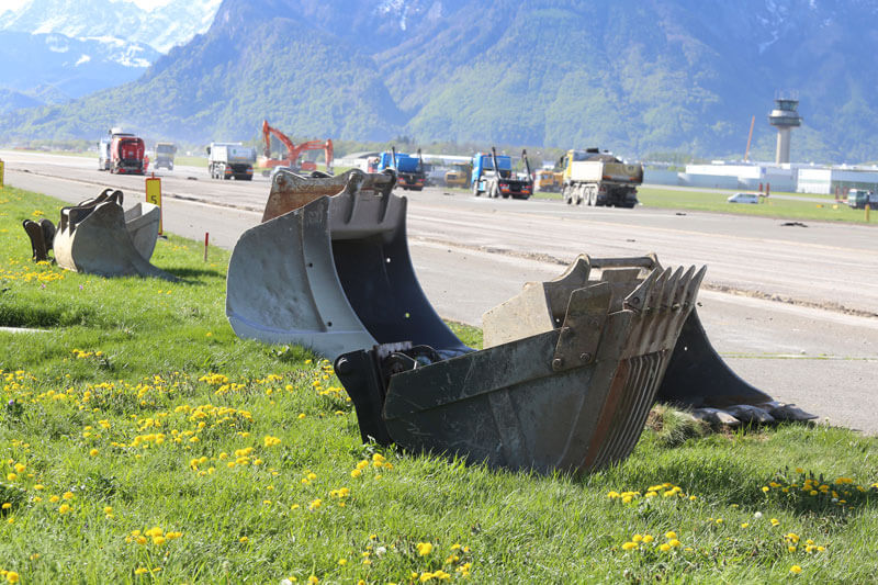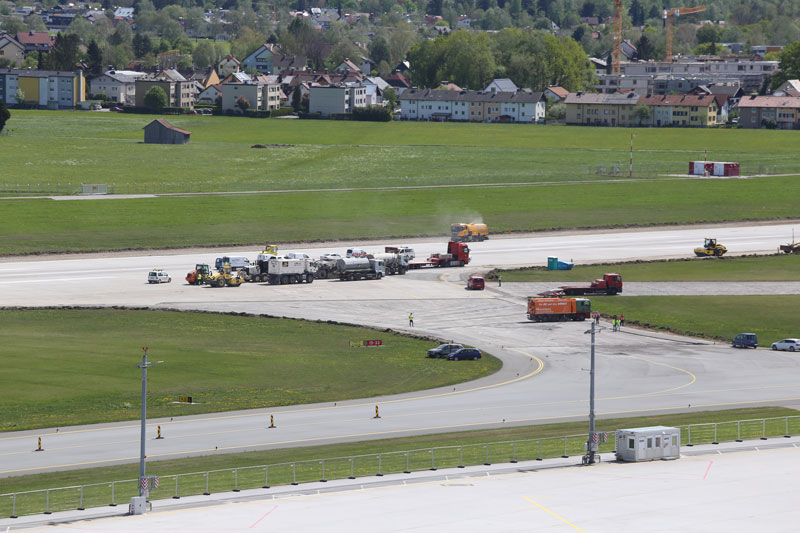 Die Baustellenfahrzeuge haben pünktlich in der Nacht vom 23.04. auf den 24.04. die Lande- und Startbahn des Salzburger Flughafens in „Besitz“ genommen, Baustellenzäune errichtet und mit den Arbeiten begonnen. Die Verkehrsführungen für den Baustellenverkehr wurden aktiviert.