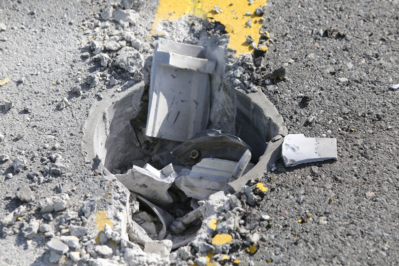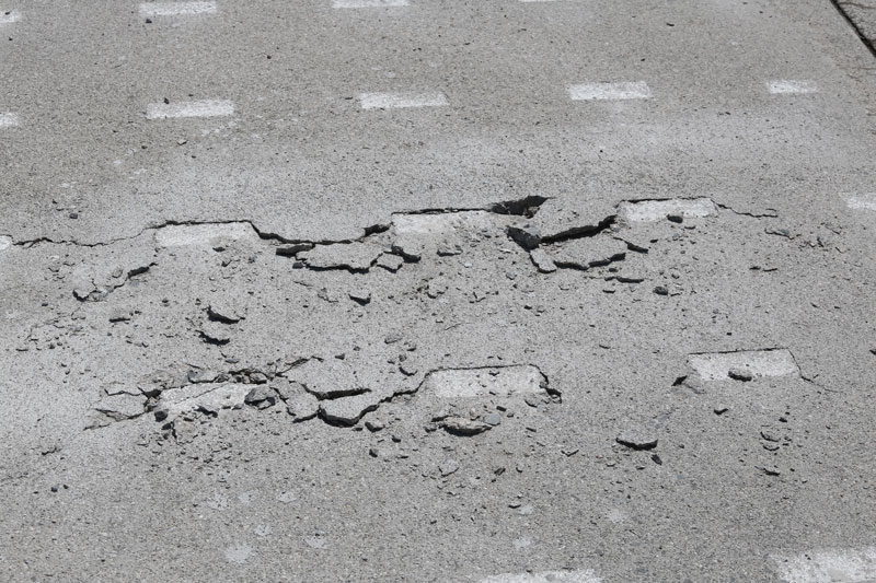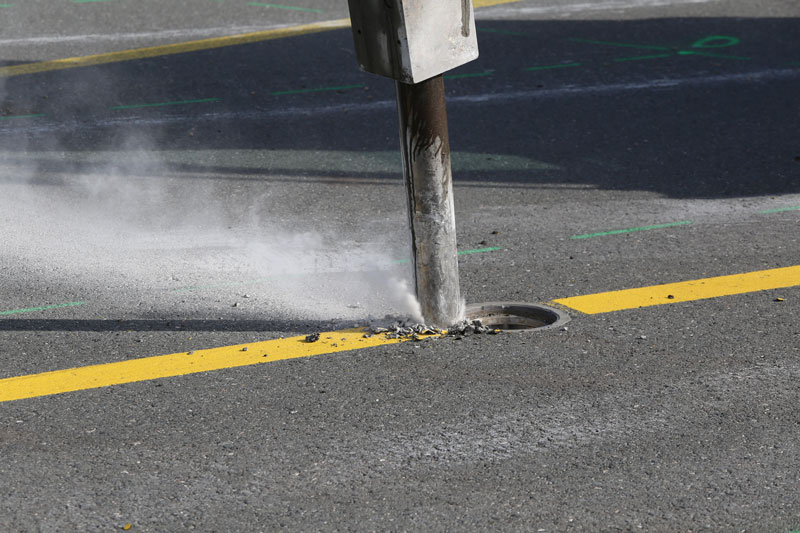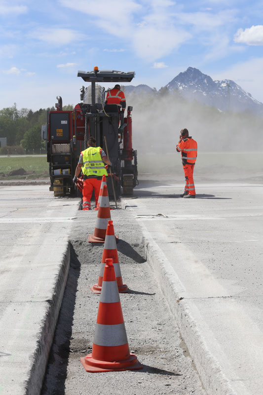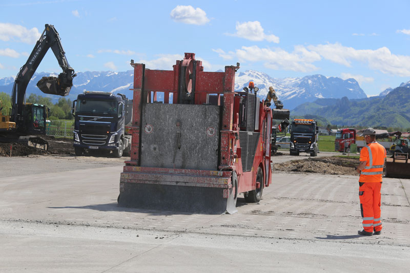 Am nächsten Tag, 25. April, wurden an der Piste die Primär Verkabelungen und Trafos für die Beleuchtung entfernt. Auch die Rollwegweiser wurden getauscht und der Gummiabrieb der Flugzeugreifen an der Aufsetzzone der Piste wurde abgefräst. Wie bereits erwähnt muss die alte Betondecke der Piste entspannt werden und dafür benötigt man Entspannungsschnitte quer zur Piste. Diese Arbeiten haben bereits gestern begonnen und werden heute fortgesetzt und in gewissen Bereichen wird bereits mittels Fallbeil die Piste „entspannt“ – sprich die Oberfläche zertrümmert.