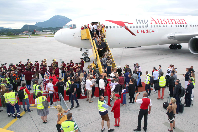 Mit einer Sondermaschine der AUA wurden nicht nur Promis zur bekanntesten AIDS-Gala via Salzburg nach Wien gebracht, auch Medienvertreter aus Amerika waren mit an Bord der Boeing 767. Um 8:40 Uhr landete die rot weis rote Maschine des österreichischen National Carriers am Salzburg Airport und verließ um 10:08 Uhr die Mozartstadt in Richtung Wien.