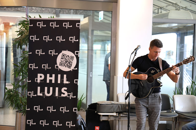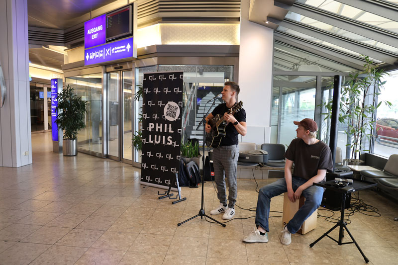 Am 27. Juli staunten die ankommenden Gäste sowie die Abholer derselbigen nicht schlecht, als ein junger Künstler mitten im Flughafenterminal, im Bereich der Ankunft, seine Songs zum Besten gab.