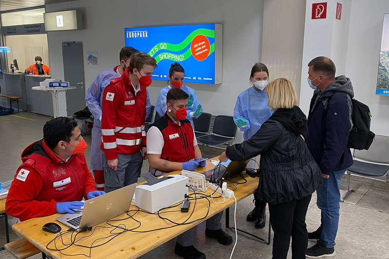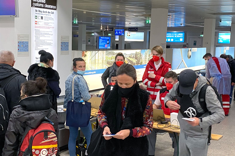 Eurowings hatte auf dem Flug von Hurghada noch einige Plätze im Flugzeug frei, diese hat der Reiseveranstalter ETI genutzt und füllte die Lücken. Bevor es zum nächstgelegenen Aufnahmezentrum nach Mondsee ging mussten die ukrainischen Passagiere noch einen CoV-Antigen-Schnelltest absolvieren, die schnelle Durchführung organisierte das Rote Kreuz direkt neben den Gepäckbändern in der Ankunftshalle.