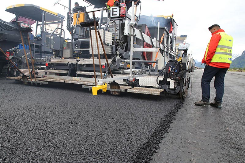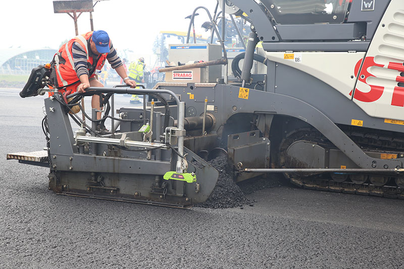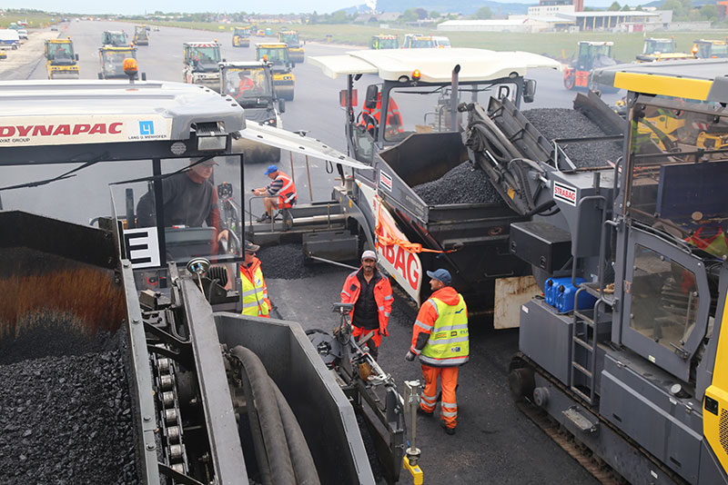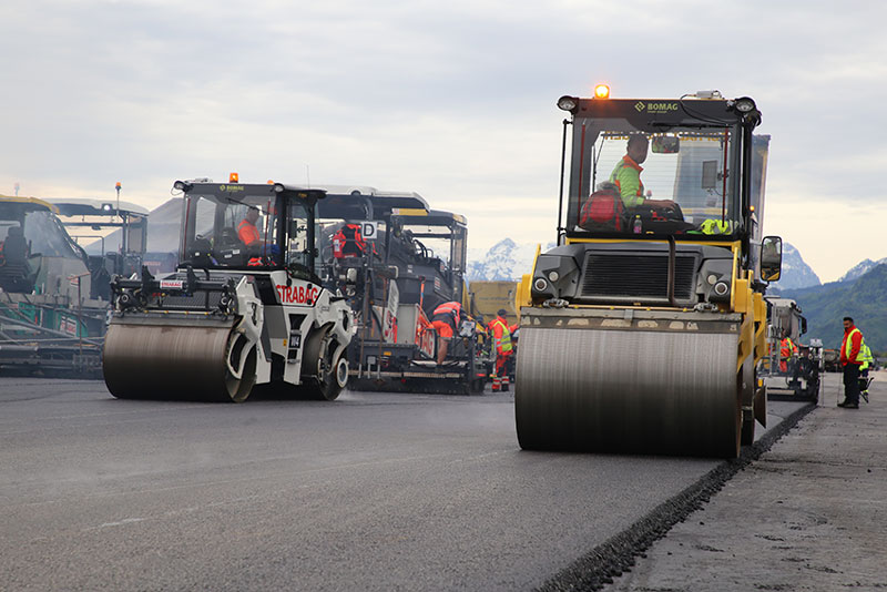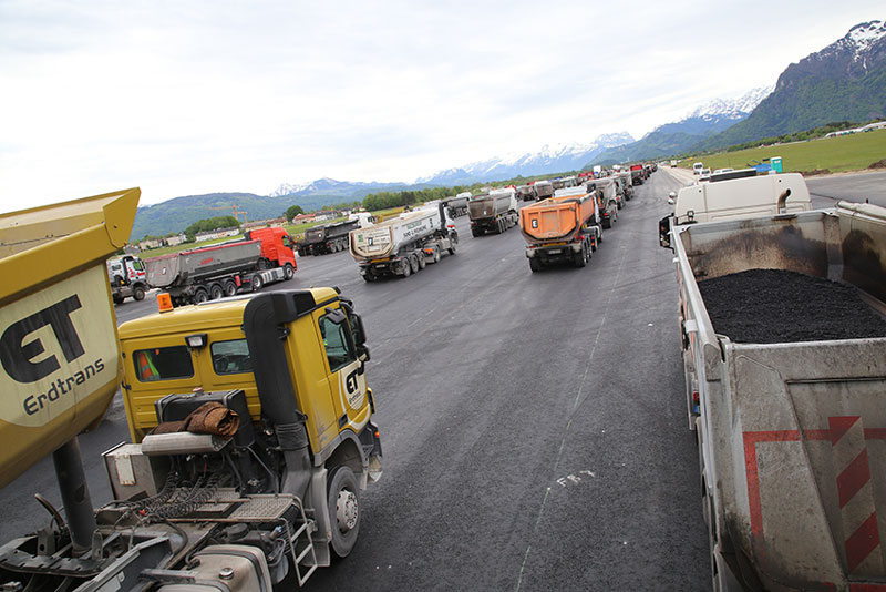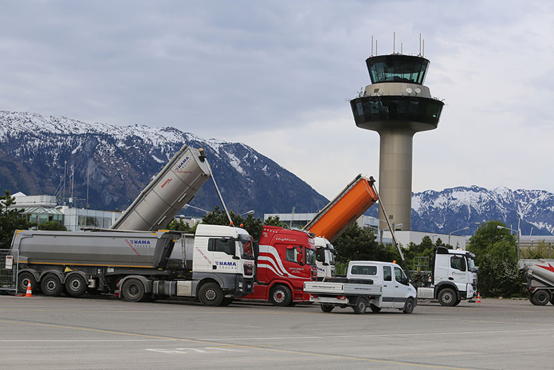 Lipold: Derzeit haben wir 50% der Deckschicht (die oberste von vier Asphaltschichten) für die neue Piste bereits eingebaut. Damit wurden in Summe etwa 87.000 Tonnen der Gesamtleistung von 115.000 Tonnen erbracht.