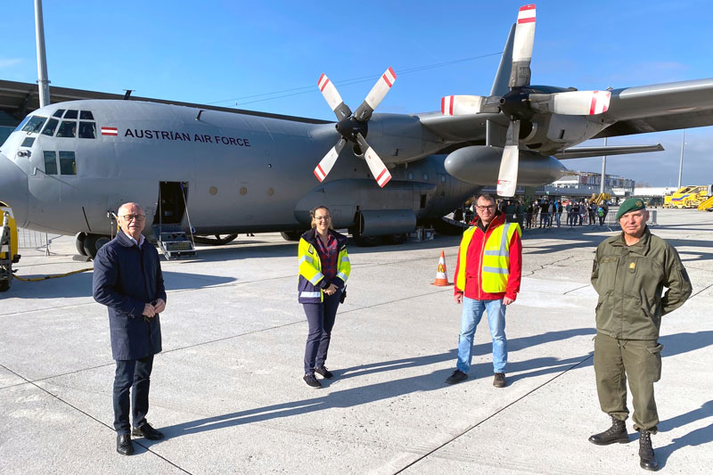 Bereits zum zweiten Mal wurde der Flughafen Salzburg Schauplatz für eine ganz besondere Impfaktion. Gemeinsam mit dem Land Salzburg, dem österreichischen Bundesheer und dem Roten Kreuz wurde kurzfristig eine C130 Hercules Militärtransportmaschine für die Immunisierung vieler Salzburgerinnen und Salzburger umfunktioniert. Pünktlich um 9 Uhr landete die Maschine, von Linz kommend, in Salzburg.