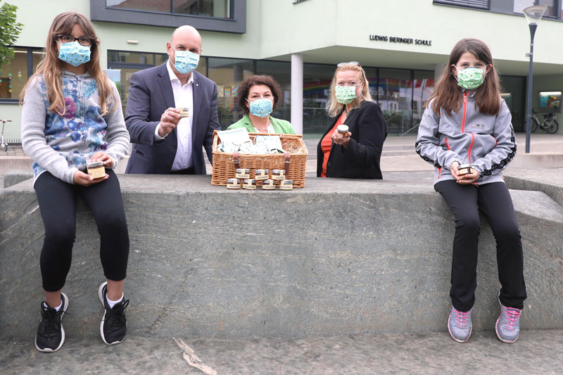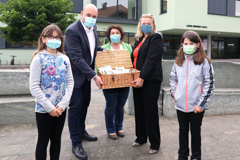 Die Masken bestehen aus zwei Stoffschichten, können bei 60° gewaschen werden und sind nachhaltig wiederverwendbar. Zudem verfügen sie über eine Einschuböffnung, die z.B. für ein Taschentuch als zusätzlichem Filter genutzt werden kann. Letzte Woche übergab Flughafengeschäftsführerin Bettina Ganghofer Honig und Mund-Nasen-Schutz an Direktorin Claudia Hölzl und Bürgermeister Joachim Maislinger. Stellvertretend für alle Schüler nahmen zwei Volksschüler der 4. Klassen an der Übergabe teil.